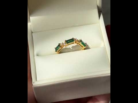 Juvetti white gold ring showcasing ethical lab-grown baguette-cut emeralds and round brilliant diamonds.