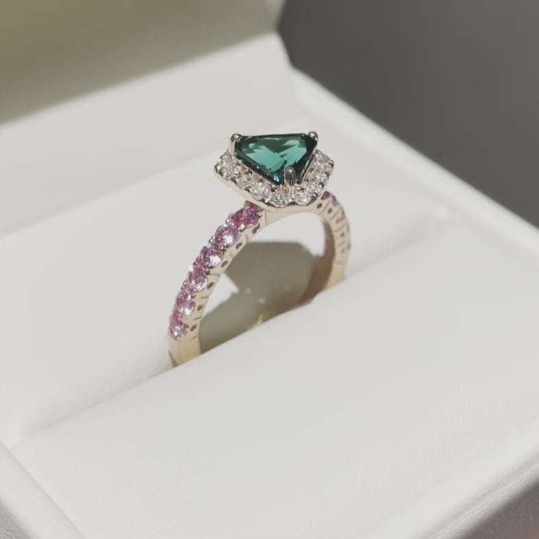 Diana triangle halo ring in rose gold set with Emerald, Diamonds and Pink sapphires.
