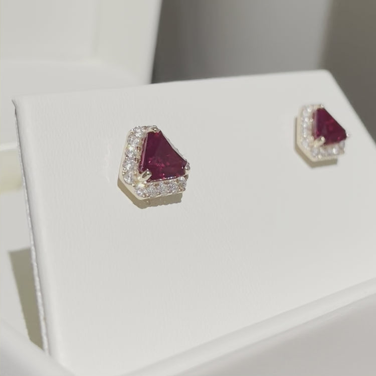 Diana Ruby Triangle Cut & Diamond Halo Stud Earrings in Rose Gold