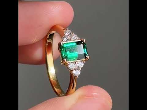 Juvetti yellow gold ring featuring an emerald-cut lab-grown emerald with lab-grown diamond side stones.