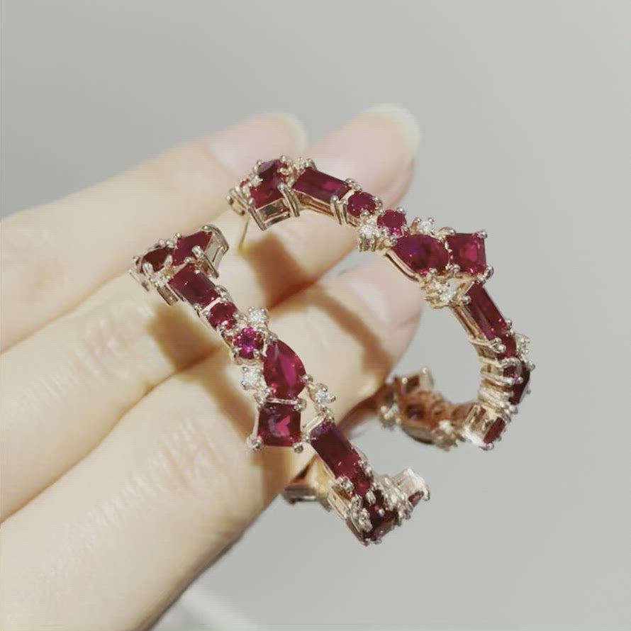 Lanna large hoop earrings in 18K pink gold vermeil set with lab grown diamond and ruby gem stones. Perfect for yourself and as gift.