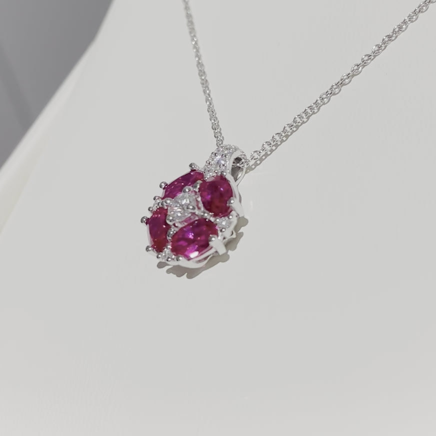 Pristi Oval Ruby & Diamond Cluster Pendant in White Gold