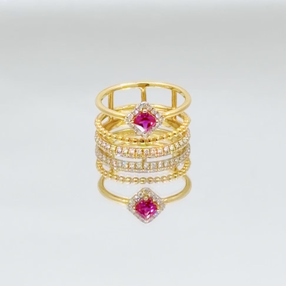 Stack of three silver rings with a red ruby gemstone in process cut and round diamonds pavé