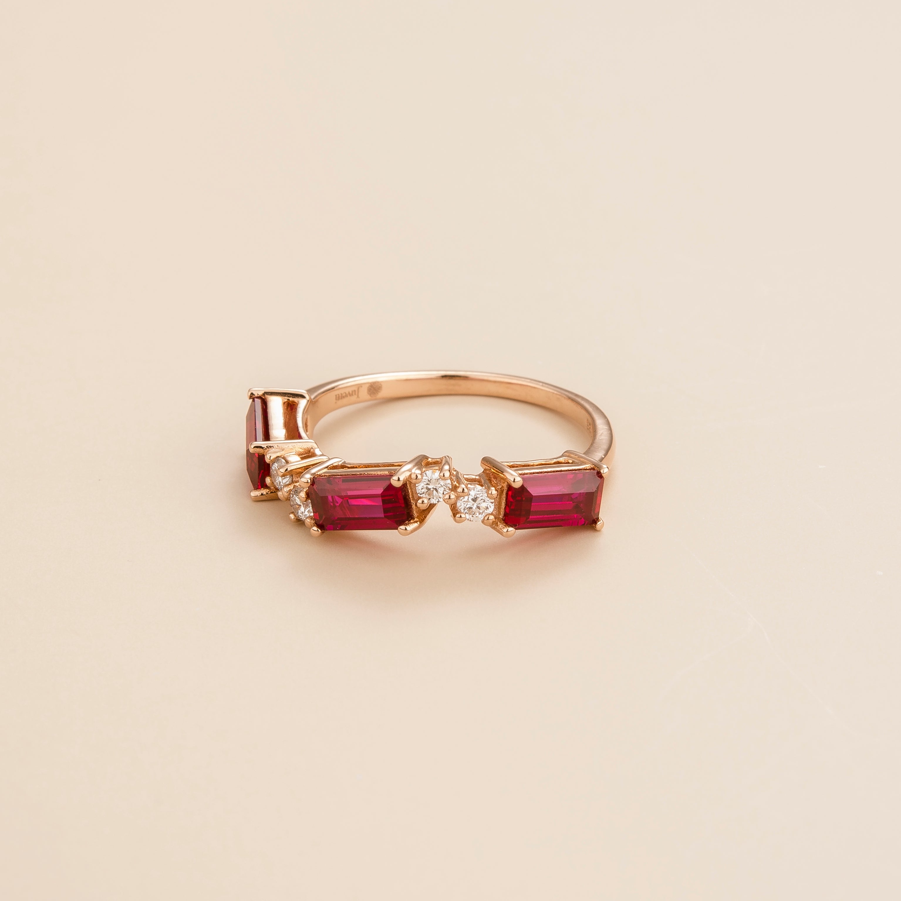 Juvetti gold ring showcasing ethical lab-grown baguette-cut ruby and round brilliant diamonds.Forma Ring In Ruby And Diamond Set In Gold Juvetti UK