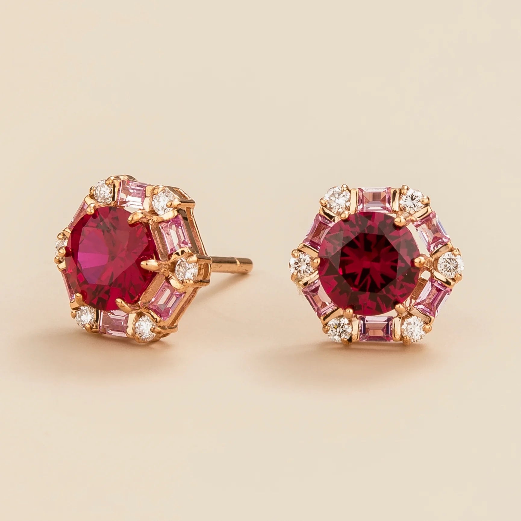 Amore earrings in 18k pink gold vermeil set with lab grown diamond and ruby gem stones.Amore earrings, Diana ring, Forma ring and bracelet in 18k pink gold vermeil set with lab grown diamond , pink sapphire and ruby gem stones.