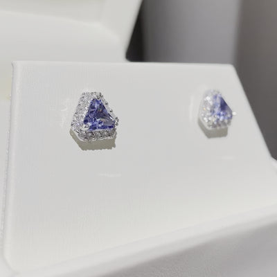 Diana Pastel Blue Sapphire Triangle Cut & Diamond Halo Stud Earrings in White Gold