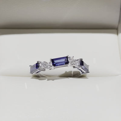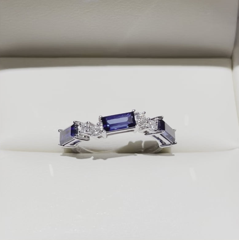 Juvetti white gold ring showcasing ethical lab-grown baguette-cut royal blue sapphires and round brilliant diamonds.