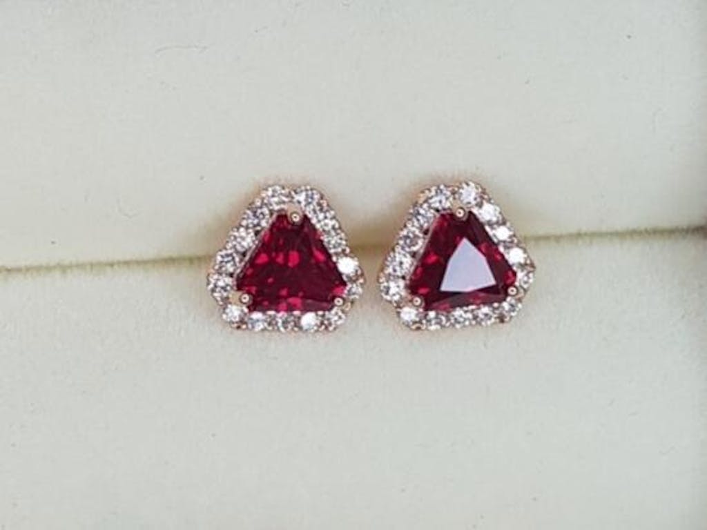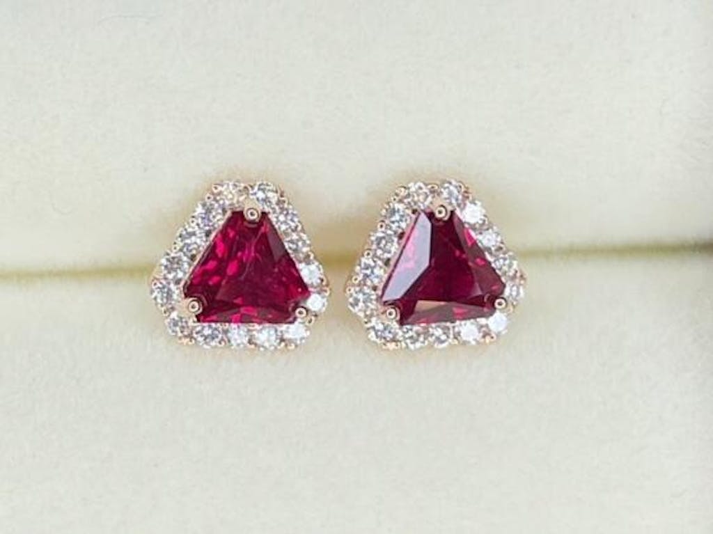 Diana triangle earrings in pink gold set with Ruby and Diamond gemstones.