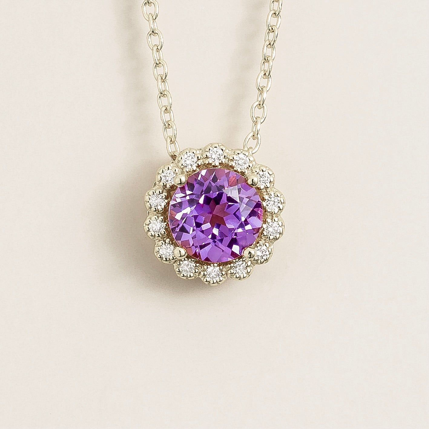 Solen halo pendant necklace set in white gold with Purple sapphire and Diamonds.