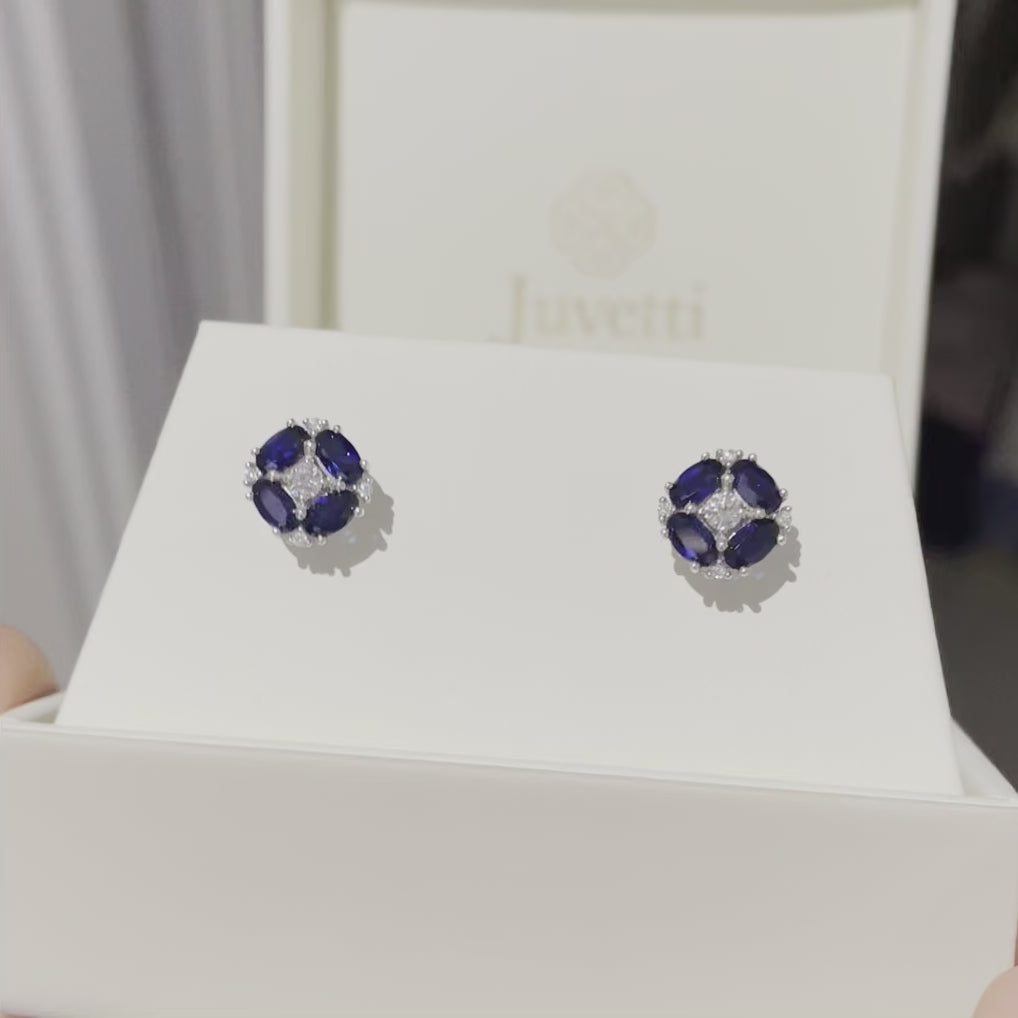 Pristi Oval Blue Sapphire & Diamond Cluster Earrings in White Gold