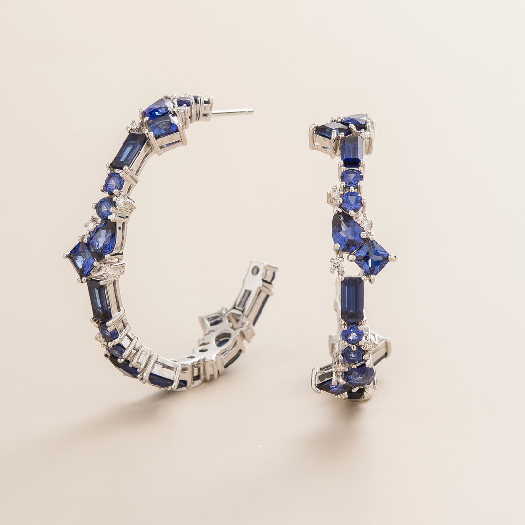 Lanna large hoop earrings in white gold set with Blue sapphires and Diamonds.