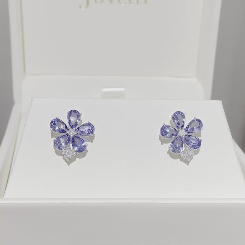 Florea 5 petals flower earrings in white gold set with Pastel blue sapphires and Diamonds.