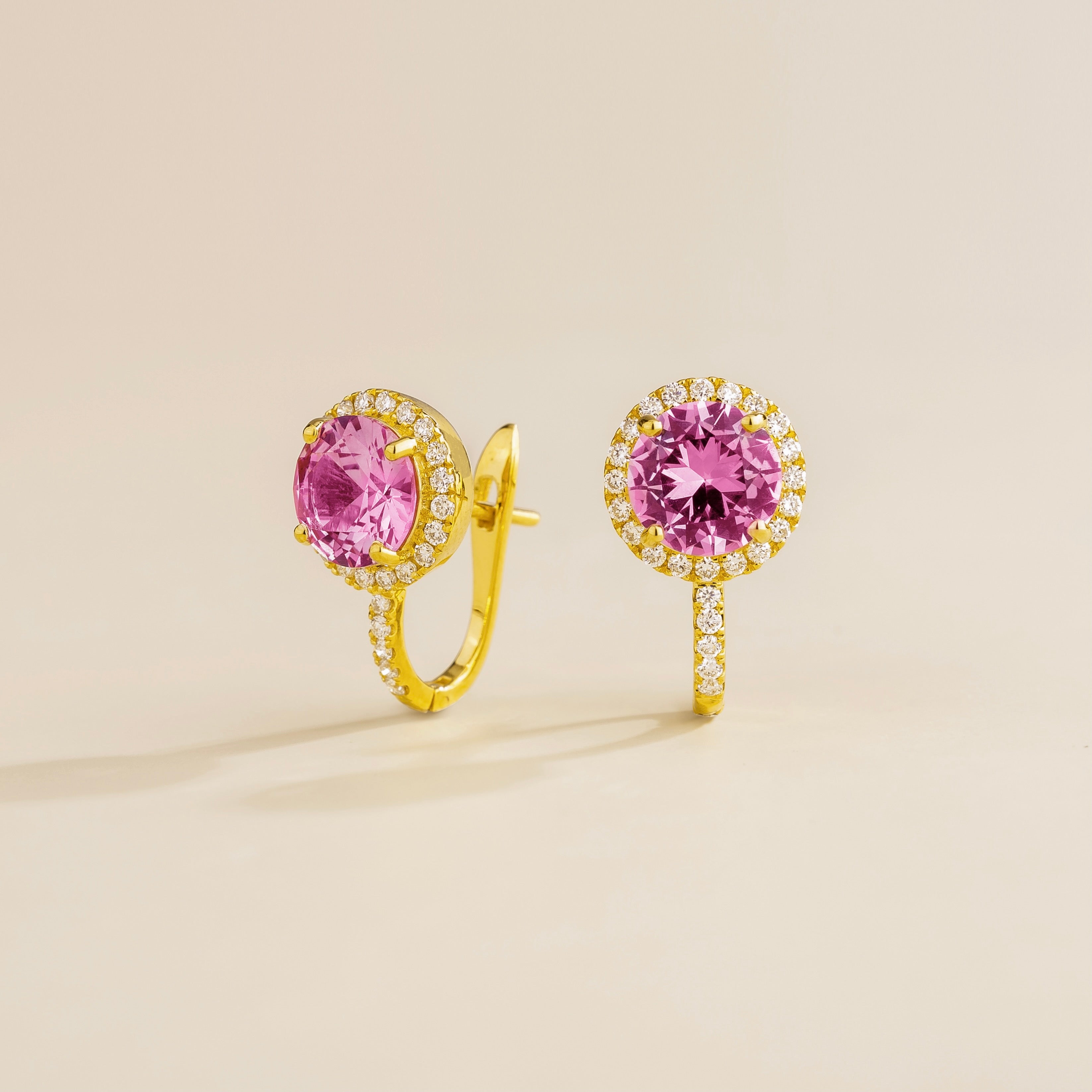 Djerv Pink Sapphire & Diamond Halo Hudggie Earrings in Gold