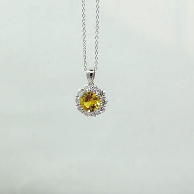 Juvetti white gold pendant necklace featuring a round lab-grown pink sapphire with a diamond halo.