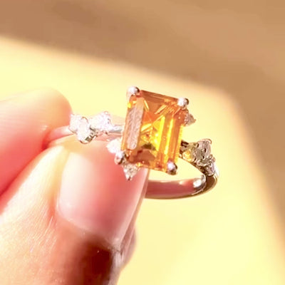 Juvetti white gold ring featuring an emerald-cut lab-grown yellow sapphire accented with lab-grown diamonds.