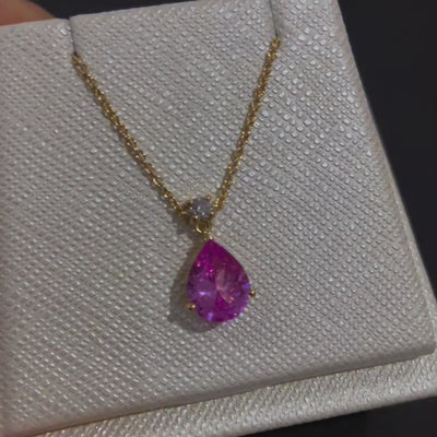 A classic gold necklace with a pear shape pink sapphire pendant and a smaller round diamond, displayed against a neutral background.