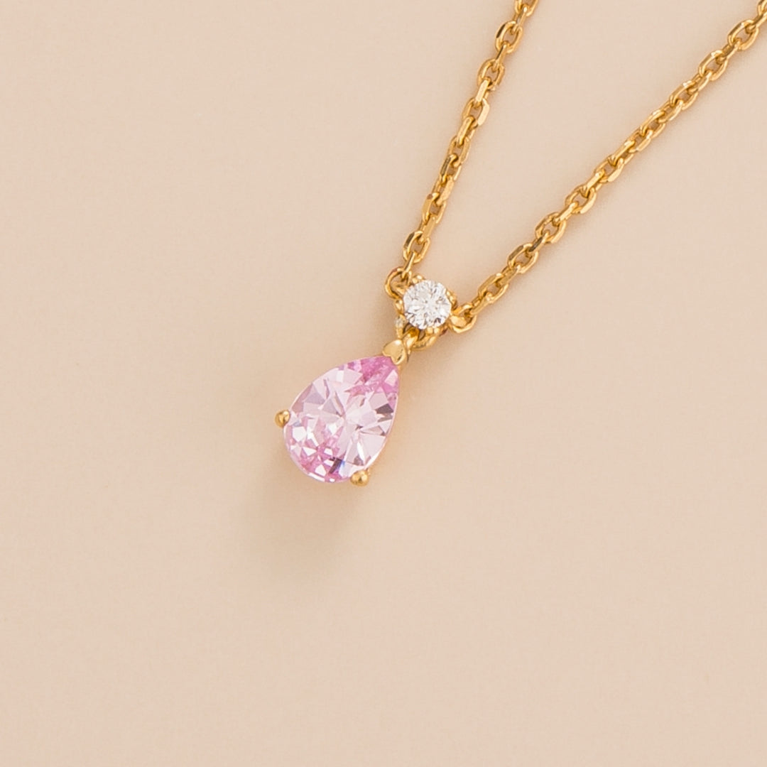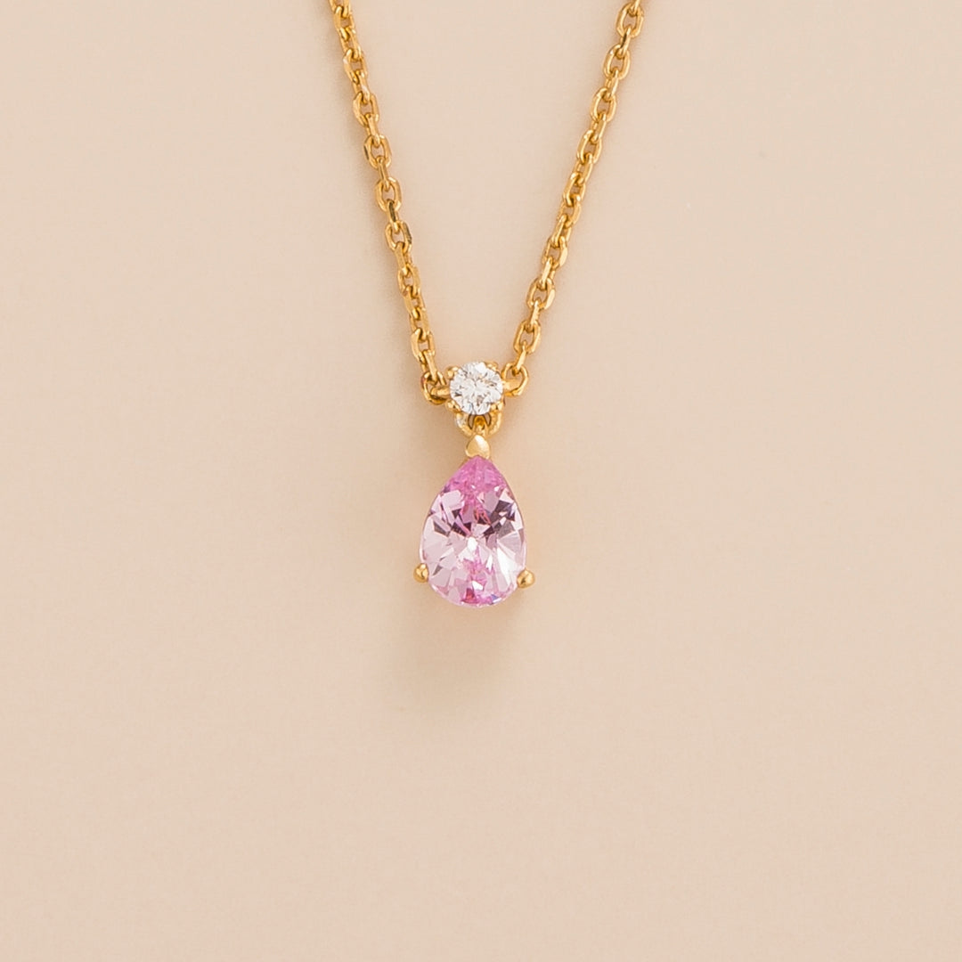 Ori necklace in 18K gold vermeil set with lab grown pear drop pink sapphire and round diamond gem stones.