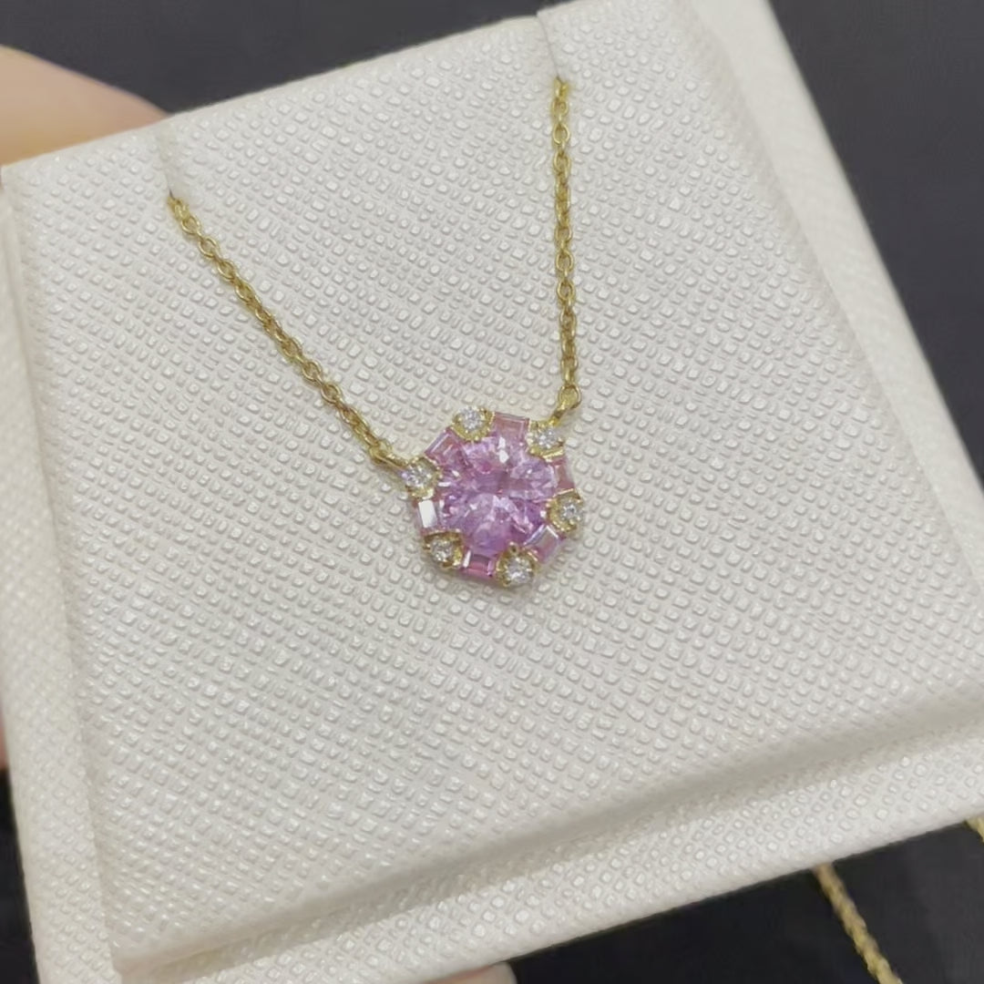 Melba necklace set in gold with Pink sapphires and Diamonds. Subtle yet iconic piece in hexagon.