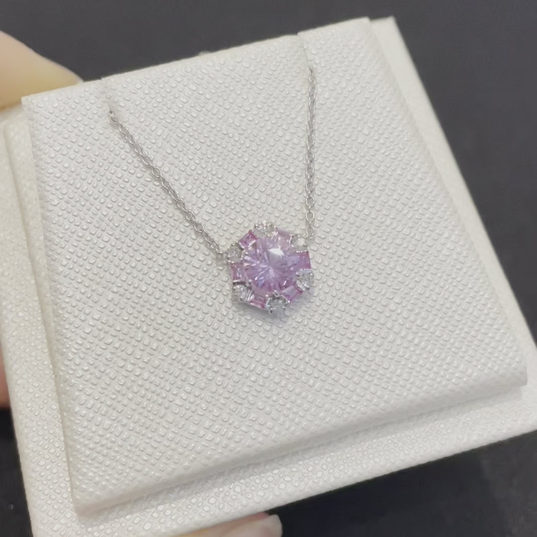 Melba necklace in white gold set with Pink sapphires and Diamonds. Subtle yet iconic piece in hexagon.