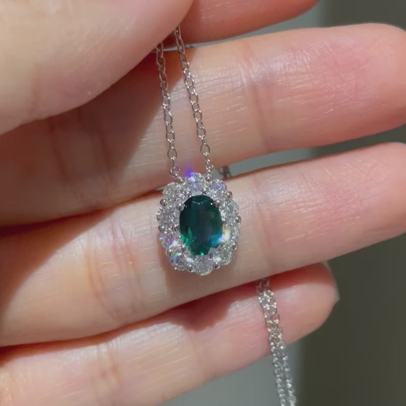 Prill Emerald Oval & Diamond Halo Necklace In White Gold