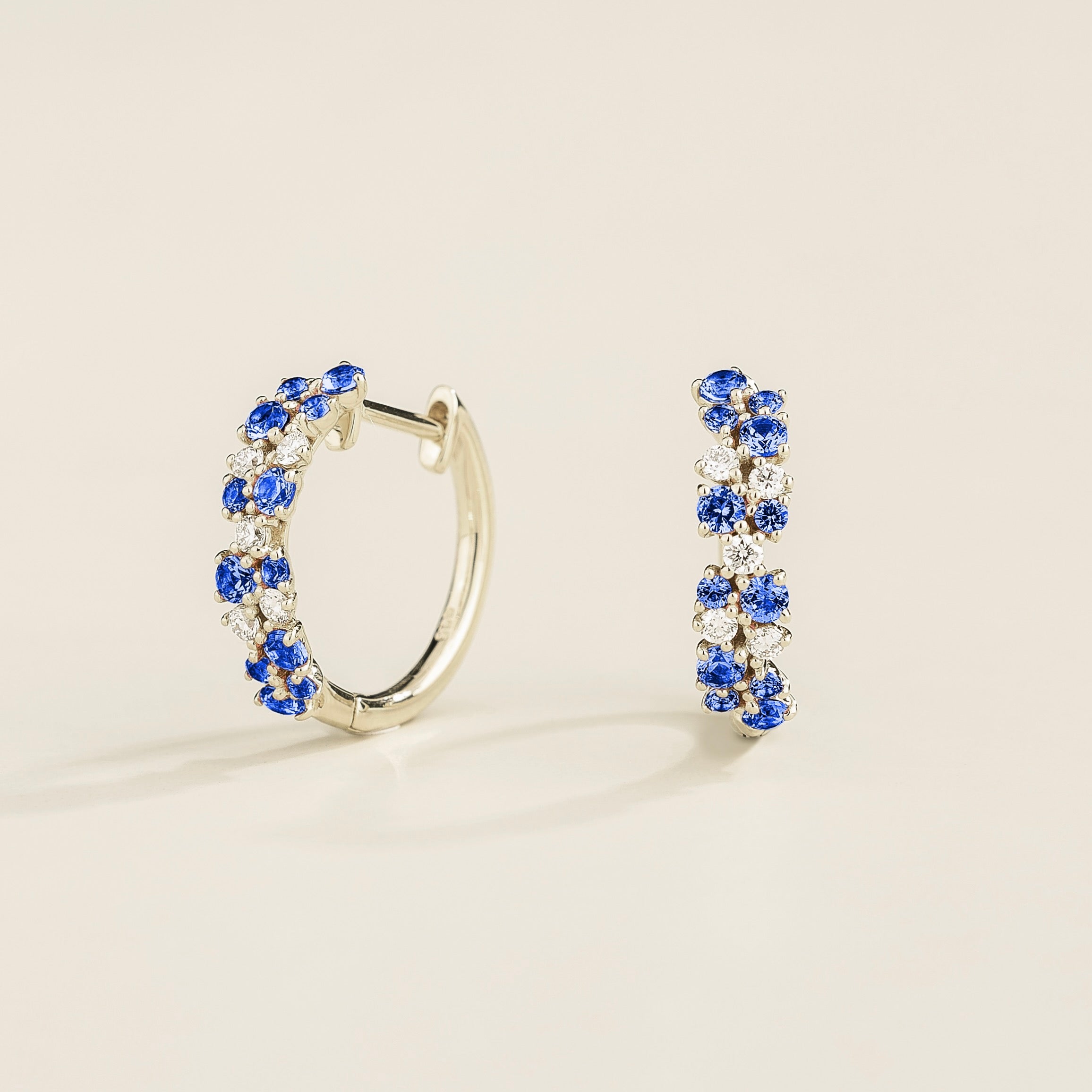 A pair of white gold huggie earrings set with cluster of round blue sapphire and diamond accents, displayed against a neutral background.