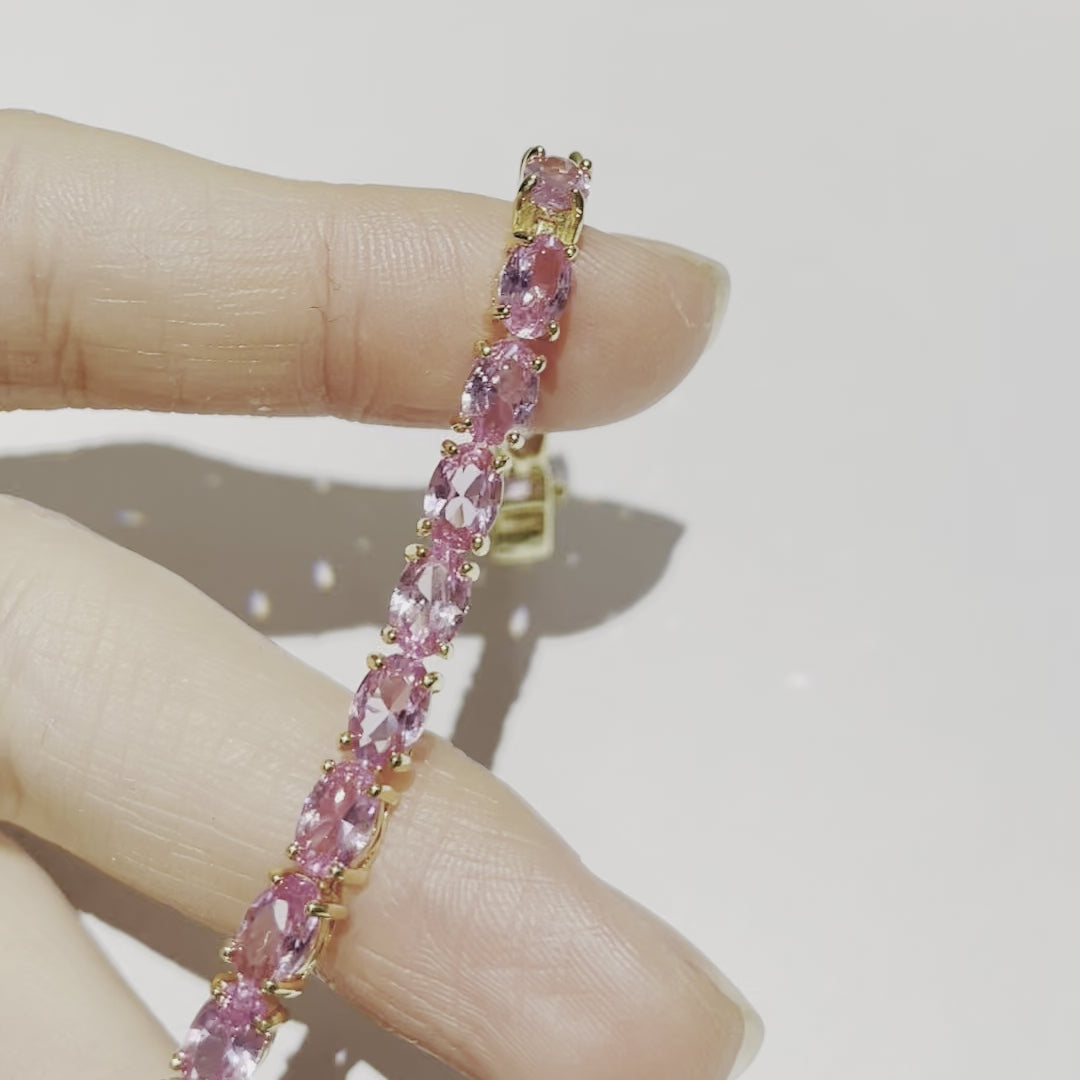 Salto tennis bracelet in gold set with ~18 carats 6mm x 4mm oval cut Pink sapphire gemstones.