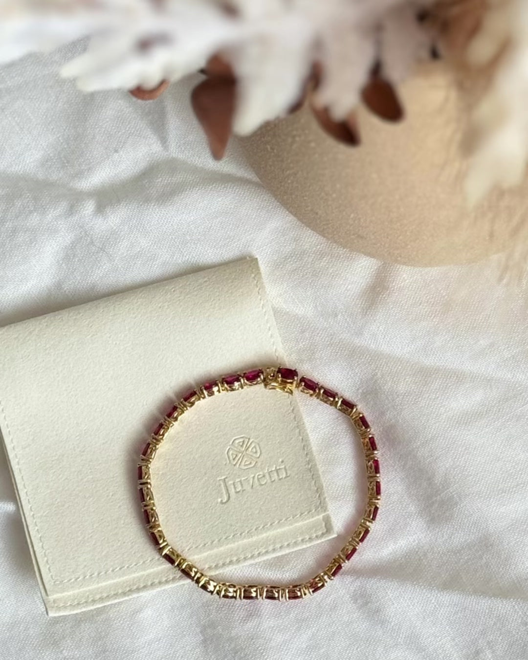 A gold tennis bracelet set with oval-shaped ruby gemstones. Best London Jewellery Store