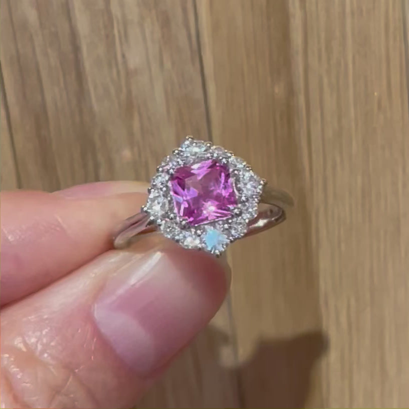 Pink sapphire: ~1.3 carat (6mm x 6mm cushion cut)